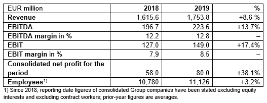 Revenue reached a new record value of EUR 1,753.8 million. Compared with the previous year (EUR 1,615.6 million) that corresponds to an increase of 8.6 percent. This improvement can be attributed to increased demand in the most important markets of Europe, North America, Russia, and China. For example, profitability increased year-on-year, despite a shift in revenue within the product groups and regions as well as additional expenses in future-proof structures – GPO implementation, commencement of the rollout of a uniform ERP system, PALFINGER 21st. EBITDA increased by 13.7 percent from EUR 196.7 million to EUR 223.6 million, while the EBITDA margin was 12.8 percent after amounting to 12.2 percent in fiscal year 2018. EBIT increased by 17.4 percent to EUR 149.0 million – the highest level in the history of PALFINGER. The EBIT margin rose from 7.9 percent in 2018 to 8.5 percent in 2019.