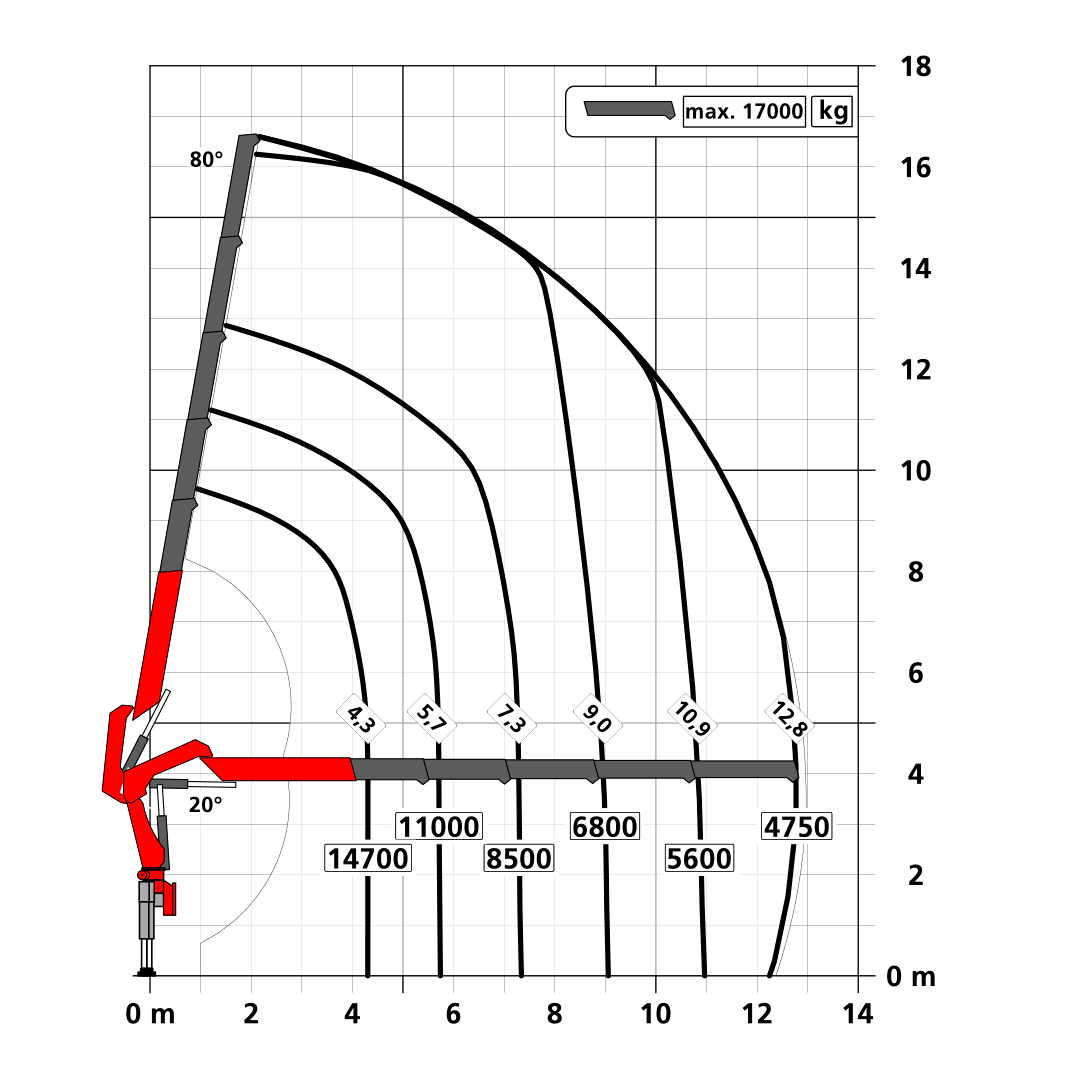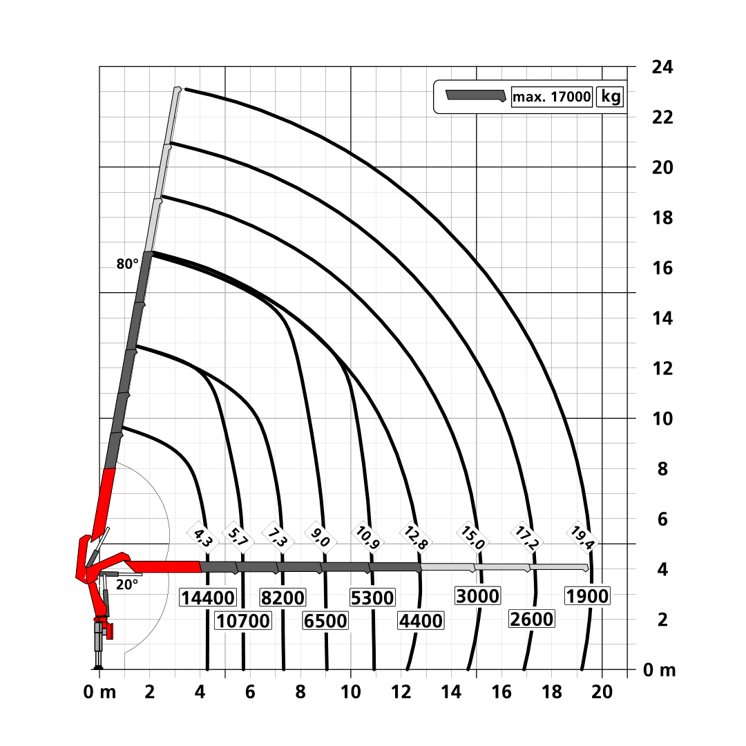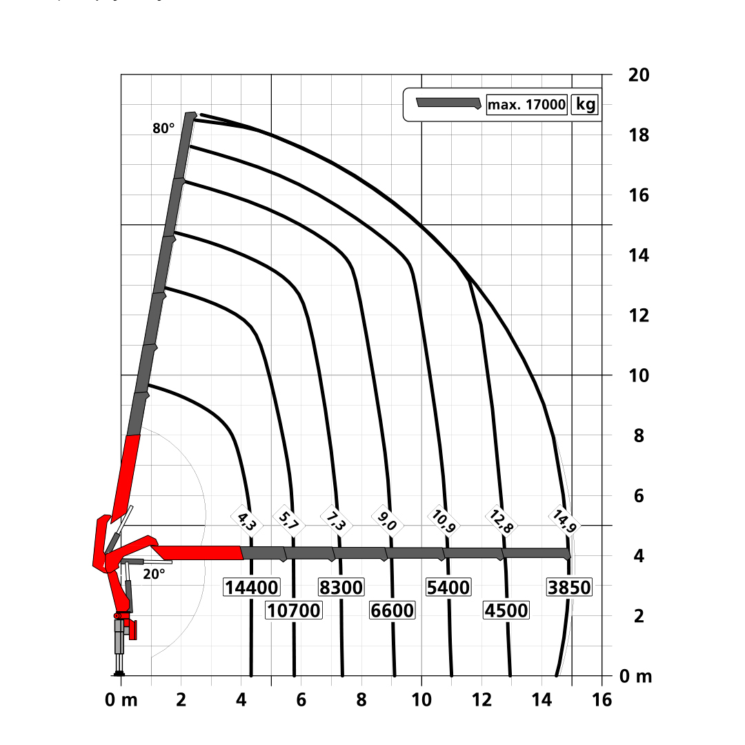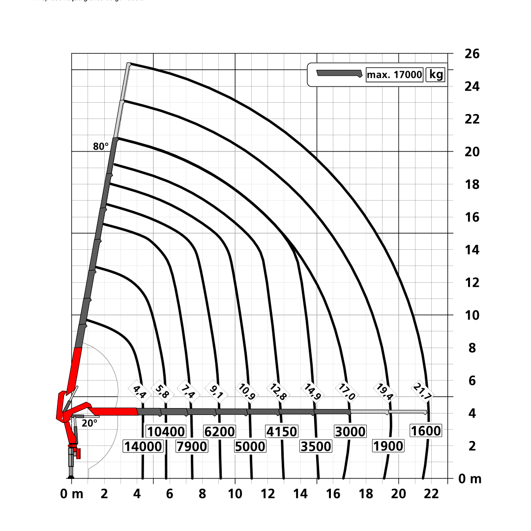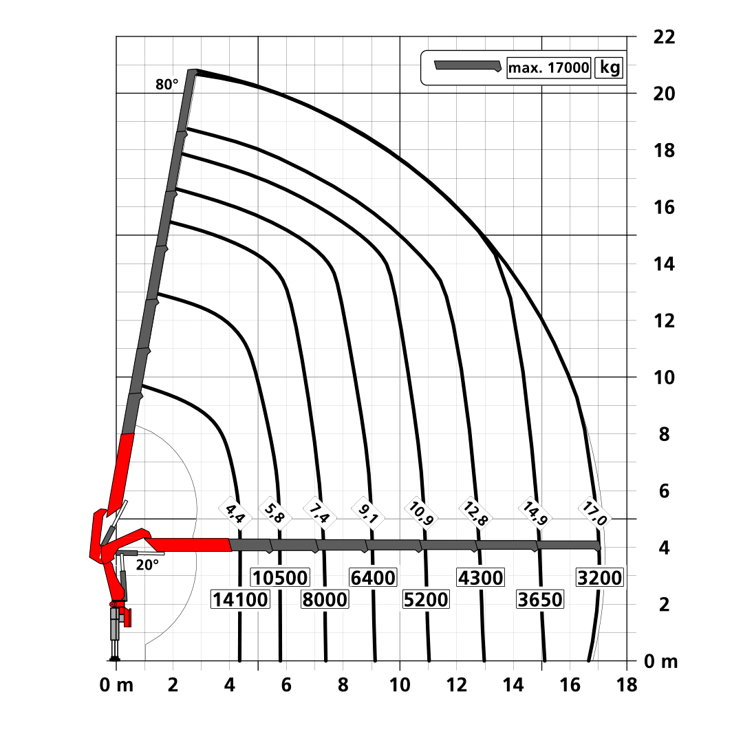 Estabilizadores com abertura de 8,6 m, garantindo estabilidade necessária para a operação.