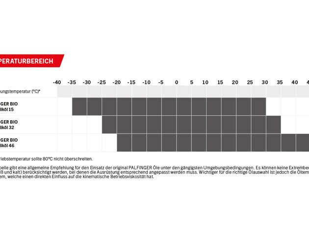 *Die Tabelle gibt eine allgemeine Empfehlung für den Einsatz der original PALFINGER Öle unter den gängigsten Umgebungsbedingungen. Es können keine Extrembedingungen (heiß und kalt) berücksichtigt werden, bei denen die Ausrüstung entsprechend angepasst werden muss. Wichtiger für die richtige Ölauswahl ist jedoch die Öltemperatur im System, welche einen direkten Einfluss auf die kinematische Betriebsviskosität hat.