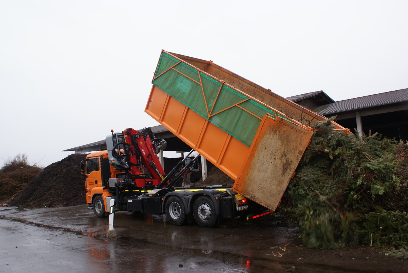 Jetzt wird mit dem neuen Sammelfahrzeug das Grüngut am Wertstoffhof unsortiert oder lediglich grob sortiert abtransportiert. Regelmäßige Abholungen verringern den Platzbedarf vor Ort. Dank zweier Abrollbehälter mit einer Länge von jeweils 6,25 Meter und einem Volumen von ca. 35m³ kann das Fahrzeug jede Menge Material mitnehmen. Zusätzlich kann das Fahrzeug mit reinen Containerzügen ohne Kran unterstützt werden um noch mehr Material abzutransportieren. In der zentralen Kompostieranlage bei Bruckmühl wird das Grüngut somit noch unsortiert angeliefert. Erst nach dem Abladen vor Ort wird das Grüngut sortiert und gehäckselt. Dadurch wird eine höhere Qualität und Sortenreinheit bei den verschiedenen Kompostarten für den Weiterverkauf gewährleistet.