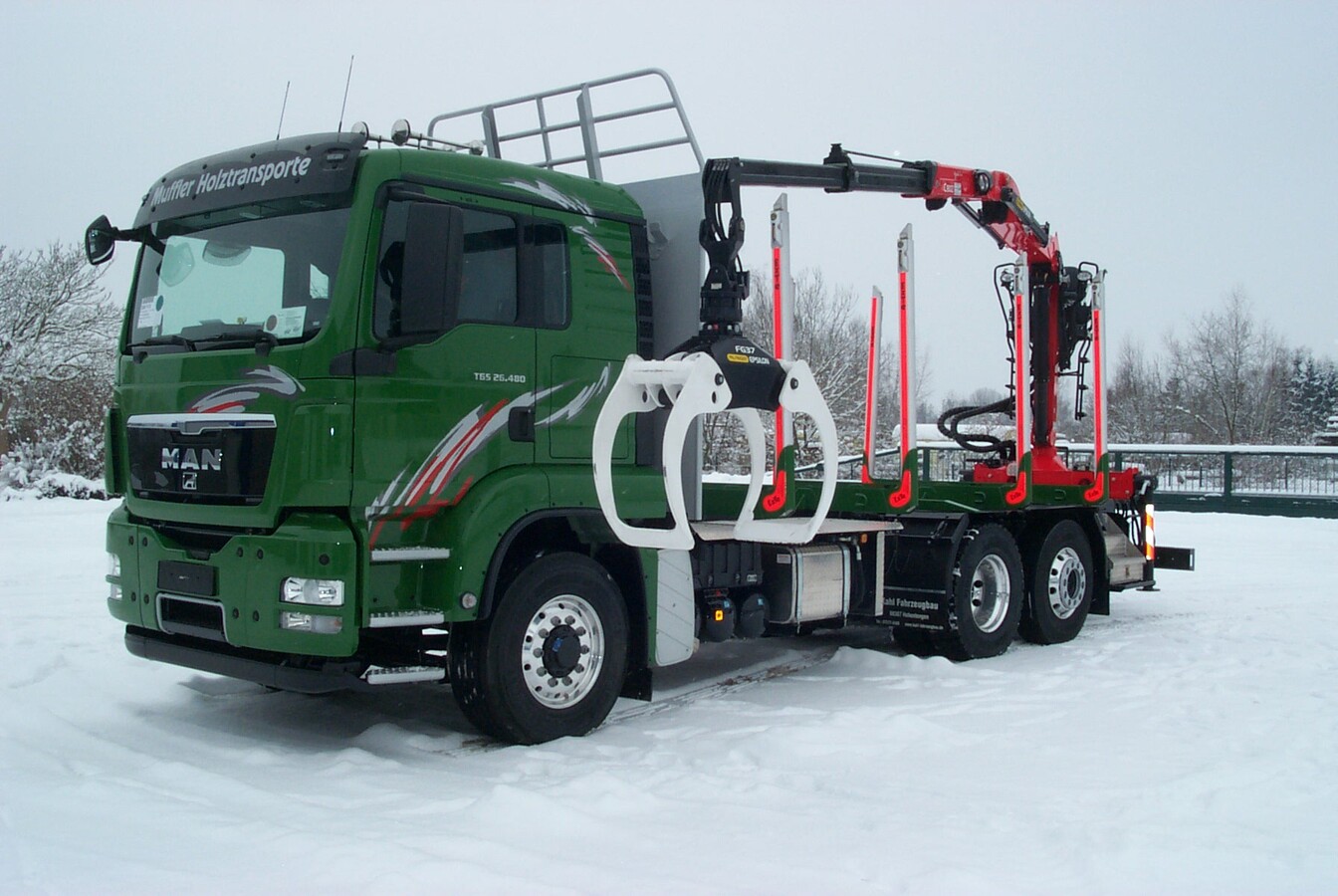 Das Ziel die anvisierten 13t nicht zu überschreiten konnte nur durch die gezielte Auswahl aller Komponenten erreicht werden. Angefangen beim LKW über den Holzkran bis hin zu den Anbauteilen wurden alle Komponenten gewichtsoptimiert ausgewählt. Der Kurzholzzug wurde so stabil wo es nötig und leicht wo es möglich ist konstruiert. So entschied man sich für einen MAN TGS 26.480 6x4 Hydrodrive mit Lenk-Liftachse und einem Radstand von 4500mm. Einen völlig neuen Weg ging man beim Hilfsrahmen. Speziell für dieses Projekt wurde ein Spezialhilfsrahmen aus Feinkornstahl in Niederbauweise entwickelt. Hierdurch wurde die Aufbauhöhe um satte 100mm niedriger gehalten als bei den üblichen Schemelaufbauten. Dies hat einen geringen Höhenschwerpunkt und damit ein besseres Fahrverhalten zur Folge.