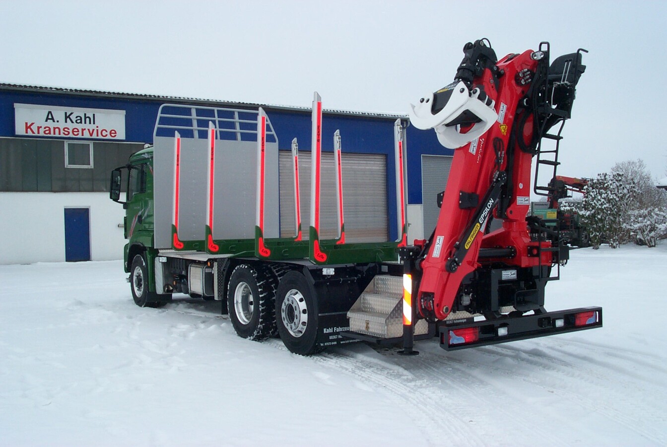 Mit dem langjährigen Partner EPSILON PALFINGER suchte man bei Fahrzeugbau Kahl den passenden Holzkran aus. Trotz großer Hubkraft und hoher Reichweite sollte der Kran möglichst leicht sein. Die Wahl fiel auf den zusammenlegbaren EPSILON Holzkran C80Z mit Doppelschwenkwerk, 8,90m Reichweite und dem Holzgreifer FG37. Welche Lasten der Kran trotz des geringen Gewichtes bewegen kann überrascht die Bediener immer wieder. Dank des Kniehebels am Hauptarm nutzt er seine Kraft optimal aus. Da der Kran im Vergleich zu anderen Holzkranen über kleinere Zylinder wird trotz Hydraulikeinkreisanlage eine sehr hohe Arbeitsgeschwindigkeit erreicht.