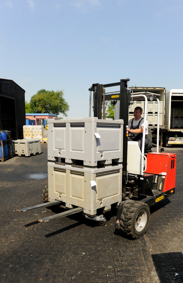 Ob palettierte Ware, Spannringfässer, Müllgroßbehälter oder die speziellen 500- oder 670-Liter-Boxen – alles kann der flinke und wendige PALFINGER F3 203 GT-S auf die Gabel nehmen und am richtigen Ort positionieren. Damit das auch mit verschmutzten und schmierigen Recyclingbehältern oder Paletten ge-lingt, ließ Fuhrparkchef Günther je eine 32er Mutter auf die vordere Staplergabeln schweißen. Die hakt sich bei Bedarf unter der Box oder der Palette ein, wodurch diese beim Zurechtschieben und Aufnehmen nicht mehr von der Gabel rutschen können.