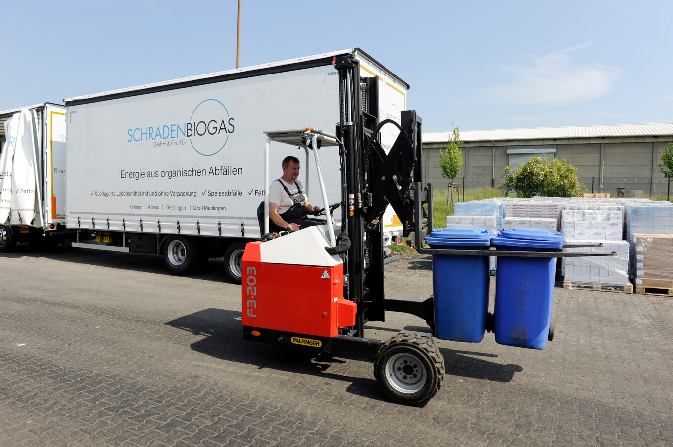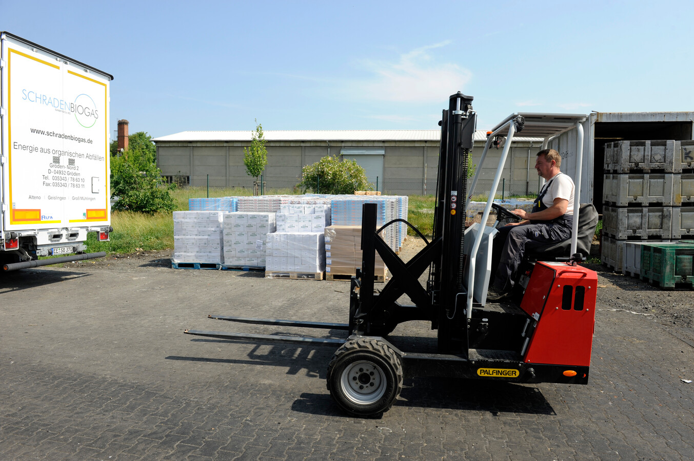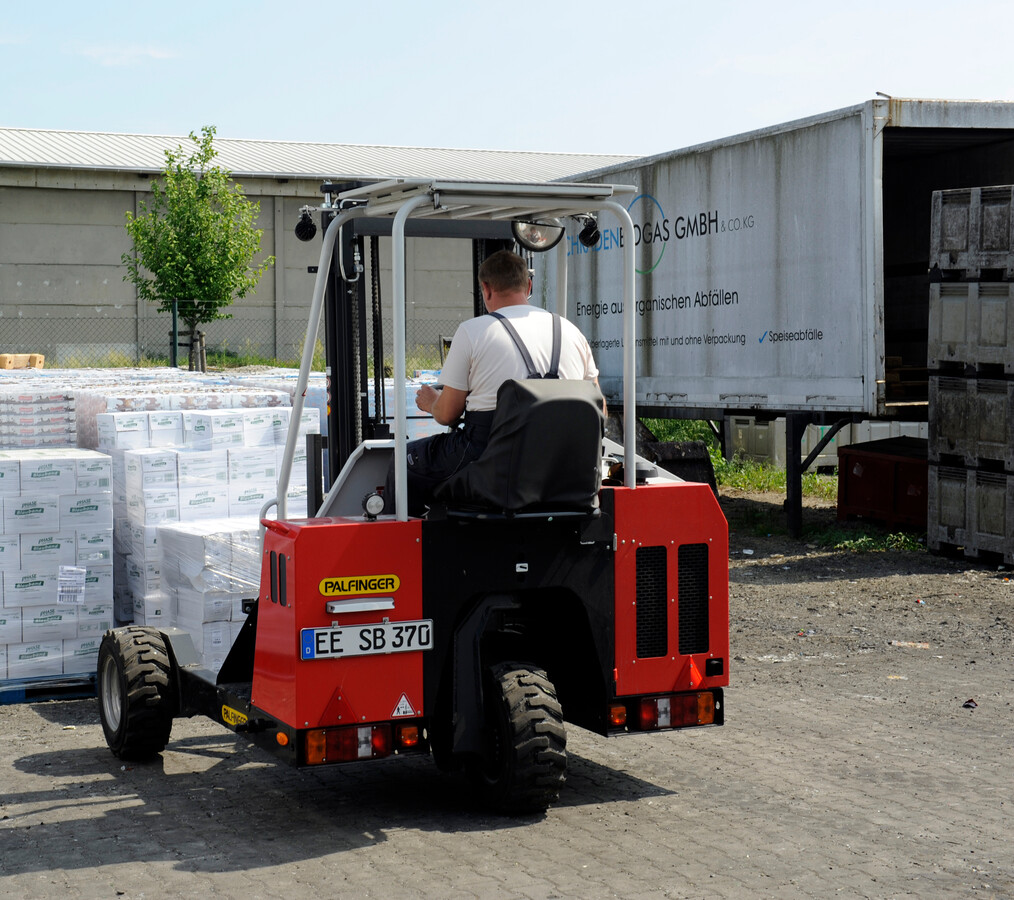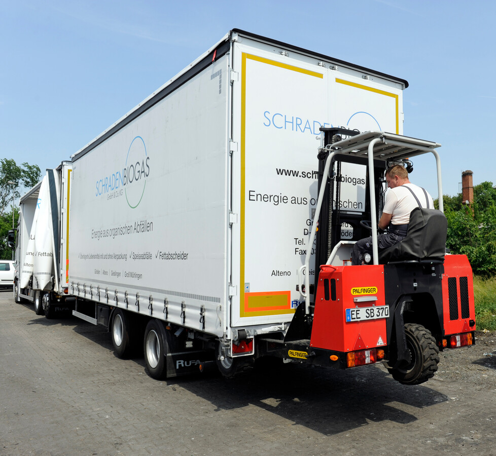Die Biogasanlage von Schradenbiogas im brandenburgischen Gröden verlangt ständig Nachschub an organischen Abfällen. Die schleppt jetzt auch ein Jumbo-Lastzug mit PALFINGER-Mitnahmestapler heran.