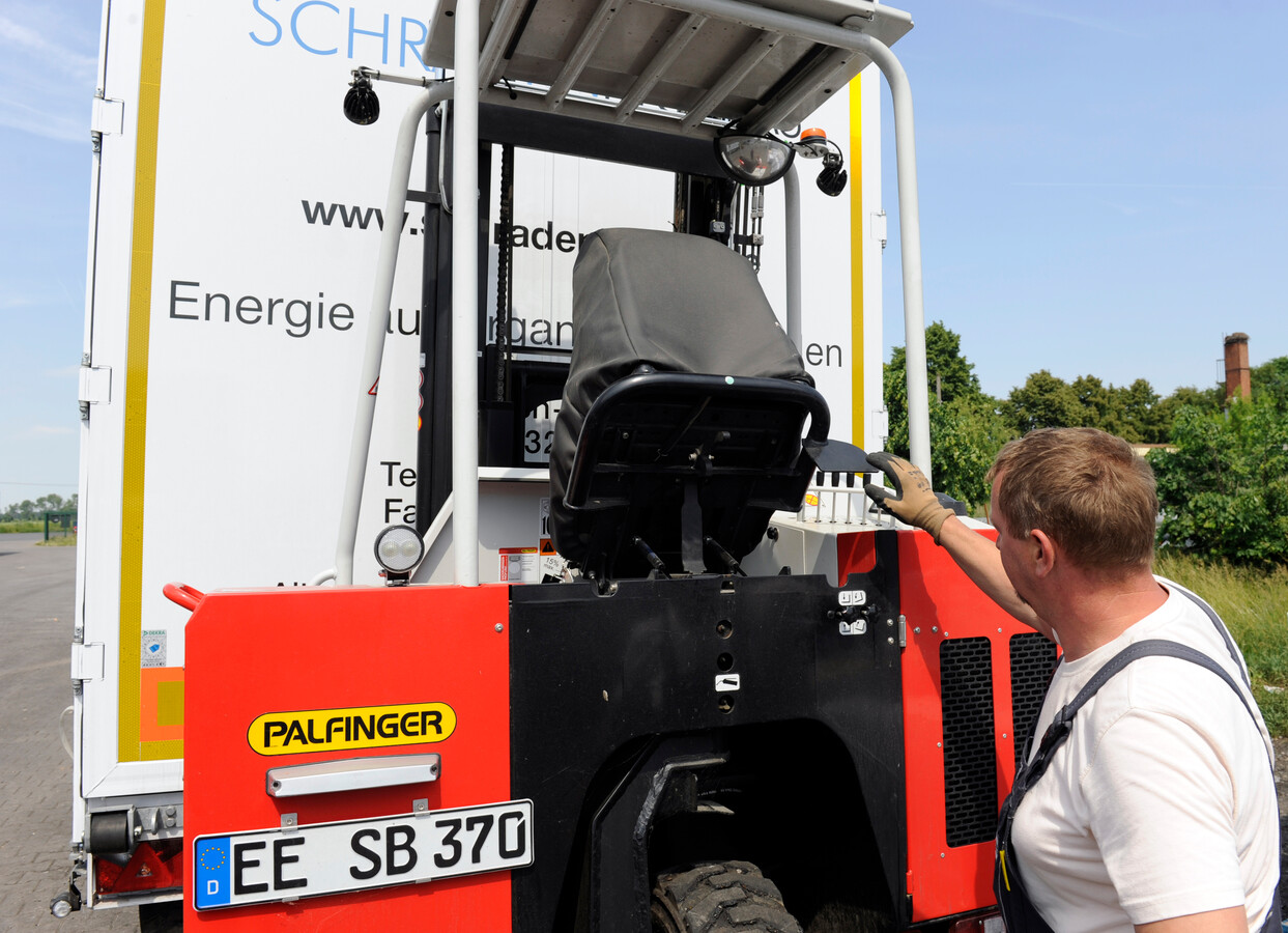 „Den Tipp mit den aufgeschweißten Muttern habe ich von Lutz Hedel bekommen. Der Gebietsverkaufs-leiter von PALFINGER hat uns im Vorfeld rundum super beraten, sich unsere Transporte und Abläufe genau angeschaut und kam am Ende sogar mit einem PALFINGER-Vorführfahrzeug vorbei, um sämtli-che Einsatzfälle für den Mitnahmestapler live durchzuspielen. Das nenne ich kundenorientiert“, betont Tino Günther, der vor 20 Jahren als Lkw-Fahrer bei Schradenbiogas begonnen hat und inzwischen Fachkraft für Abfallwirtschaft ist. Für den gelernten Zerspanungsmechaniker spielt auch der Service eine wichtige Rolle. Ohne eigene Werkstatt für die Fahrzeugtechnik ist er auf Fremddienstleistungen angewiesen. Im Fall der Fälle steht ihm die PALFINGER-Vertragswerkstatt im nahgelegenen Dresden für Reparatur und Service zur Seite. Bisher musste der zweifache Familienvater davon keinen Gebrauch machen. Bislang hat das Gerät kaum mehr als 45 Betriebsstunden ohne Auffälligkeiten absolviert.