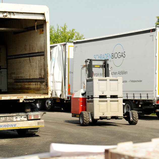 Der Hunger der Biogasanlage in Gröden ist unermesslich. Täglich muss die eigene Lastwagen-Flotte von Schradenbiogas ausrücken, um riesige Mengen an Speiseabfällen, Frittierfett und verdorbene Lebensmittel einzusammeln und an den südbrandenburgischen Standort zu transportieren. Den „Rohstoff“ holen 22 Solo-Lkw und 4 Gliederzüge im Umkreis von rund 150 Kilometer bei Restaurants, Kantinen, Kranken-häusern, Schulen, Kindergärten und Supermärkten ab. Zusätzlich bringen Bauern aus der Region ihre Rinder- und Schweinegülle mit Tankfahrzeugen zur Weiterverarbeitung in die 1.300-Seelen-Gemeinde.