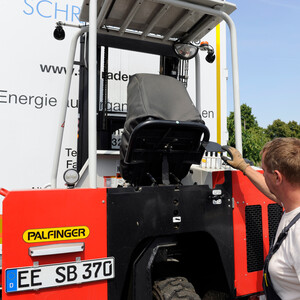 „Für mich ist diese Lösung perfekt. Während andere oft lange warten müssen, habe ich im Handumdre-hen den Stapler vom Anhänger gelöst und bediene mich mit seiner Hilfe selbst“, sagt Tobschall. Der 46-Jährige ist seit acht Jahren im Unternehmen und hat zuvor 20 Jahre Baustoffe gefahren. Daher kennt er sich mit Kran und Stapler bestens aus. Den Mitnahmestapler bedient er millimetergenau und souverän. Der feinfühligen Steuerung des PALFINGER-Staplers gibt der gelernte Landmaschinenschlosser Bestnoten.