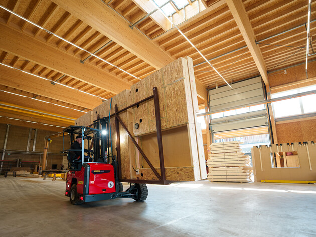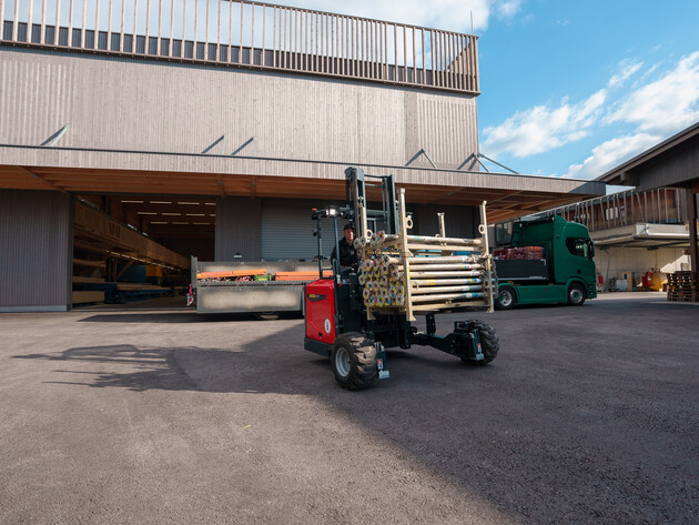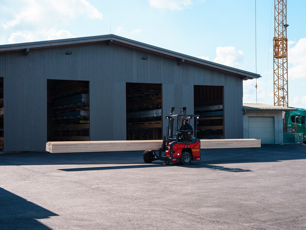 Ein weiteres Highlight war der Einsatz des PALFINGER FLM 4-Wege Mitnahmestaplers – das neueste Modell der PALFINGER Mitnahmestapler-Serie. Dank seines innovativen Mittelsitzkonzepts und der vier Fahrmodi bietet er maximale Flexibilität, auch auf engstem Raum. Beim Einsatz in Henndorf hob der FLM 4-Wege unter anderem eine Holzwand eines Fertigteilhauses. Das Bauteil wog an die zwei Tonnen – und konnte dennoch präzise und mühelos manövriert werden. Ebenso überzeugte der Stapler beim Einladen von Holzbalken in Lagerregale sowie beim Fahren auf einem steilen Schotterweg – eine Situation, die hohe Anforderungen an Traktion und Stabilität stellt.