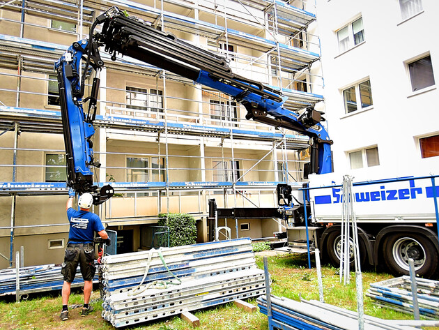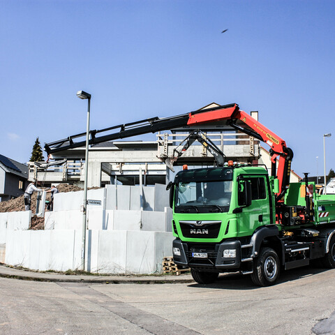 Der klassische Baustofftransport umfasst die Baustellenlogistik ab Lager oder Werk. Es ist für den Transporteur entscheidend, auf der Baustelle mit einem PALFINGER Ladekran die Last direkt neben seinem LKW entladen oder Lasten auf höhere Ebenen verheben zu können. Wenn die Baustoffe an eine bestimmte Stelle verbracht werden müssen, sind die PALFINGER Mitnahmestapler die beste Lösung.