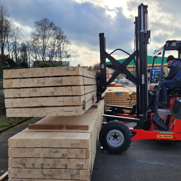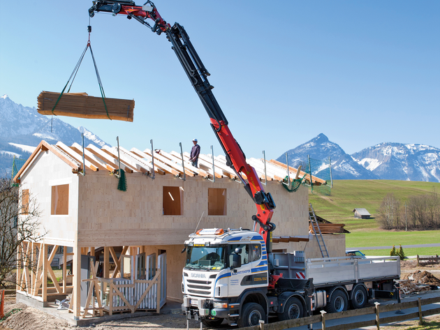 Oft bedarf es einer ausgefeilten Transportlogistik mit starker Hebelösung, um die Holzbauteile schnell und sicher zur Baustelle zu bringen. Mit dem eigenen Ladekran sind Sie unabhängig und flexibel beim Aufstellen von Hallen und Holzhäusern oder beim Platzieren fertiger Holzkonstruktionen. PALFINGER bietet Ihnen durchdachte Kranfahrzeugkonzepte mit viel Ladefläche und großen Reichweiten bei maximaler Hubkraft – speziell für den Holzbau sowie das Zimmerer- und Dachdeckergewerbe. Alle PALFINGER Ladekrane haben eine hervorragende Krangeometrie, besitzen effektive Seilwindenlösungen und zuverlässige Standsicherheitssysteme. So können Sie Ihre Kundenaufträge flexibel, schnell und wirtschaftlich abwickeln. Mit einem PALFINGER Mitnahmestapler können Sie Ihre innerbetriebliche Verladung und die Baustellenversorgung perfekt kombinieren.