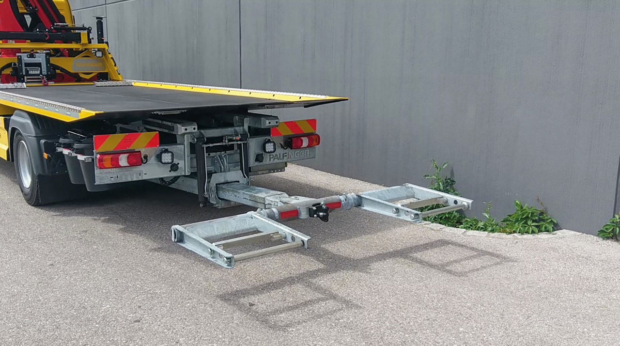 Mit der PALFINGER Funkfernsteuerung lassen sich das Plateau und der Ladekran leicht und ortsunabhängig steuern. Am Einsatzort gibt das dem Abschlepper die notwendige Flexibilität, um das Bergegut sicher und einfach auf das Plateau zu verheben.