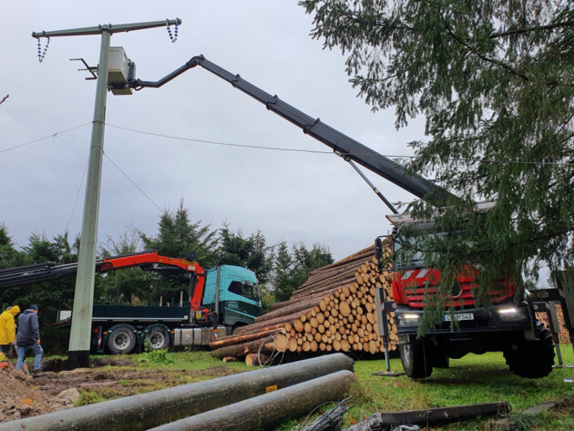 Für den Einsatz in Obergröningen sind dabei plangemäß vier Werktage in der zweiten Novemberwoche vorgesehen. An diesem Vormittag des 9. Novembers soll der neue Stahlmast aufgestellt, lotrecht justiert und abschließend in Beton eingegossen werden. Der für die Bauarbeiten notwendige Maschinenpark ist für einen möglichst einfachen, störungsfreien Ablauf bereits optimal platziert. Der Palfinger Ladekran ist auf dem Zuweg zur Baustelle unmittelbar an den Maststützpunkt gestellt. Der Bagger war und ist schon multifunktional im Einsatz: Ausheben der Baugrube, Abtransport des Altmasts und weiterer Bestandskomponenten. Im weiteren Abstand davon: eine weitere, kleiner dimensionierte Palfinger-Arbeitsbühne, die im späteren Arbeitsablauf bei der Befestigung der Leitungen am neu aufgestellten Mast eingesetzt wird. Anders als die anderen Maschinen muss die P 300 KS an dem dafür vorgesehenen Geländepunkt stabil positioniert und durch seine Stützen (jede mit einer Traglast von zehn Tonnen und einem Stützhub von 800 mm) so fixiert werden, dass er auch bei voll ausgefahrener und ausgeschwenkter Arbeitsbühne hundertprozentige Standsicherheit gewährleisten kann.