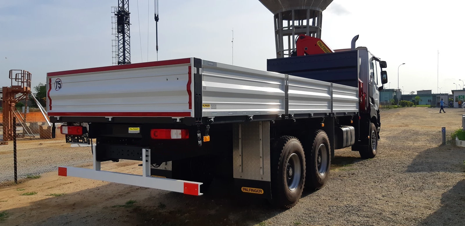 The first Turnkey Solution arrived in Ivory Coast recently. Here it will be used at a large construction site to transport various equipment. Thanks to its customized body solution even demanding conditions with 90% humidity and temperatures constantly high as 35° Celsius are no problem. The availability of a truck in combination with a reliable loader crane such as the PK 23500 from PALFINGER, with its high lifting capacity, is essential. As is the ability to master sometimes stony and especially rugged tracks. Thanks to the incredibly well-built overall truck concept from the PALFINGER Mounting Competence Center, the RENAULT TRUCKS Kcan cope with these particularly rough conditions. The trust in PALFINGER solutions is evident as the client in Ivory Coast, a major player in the construction industry, has ordered another unit already.