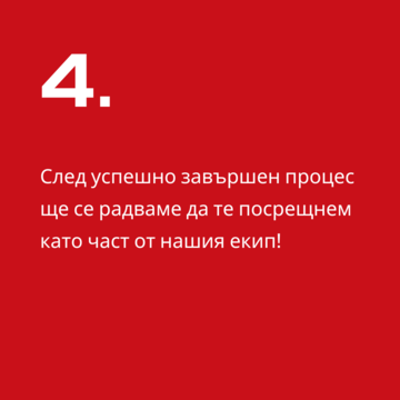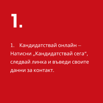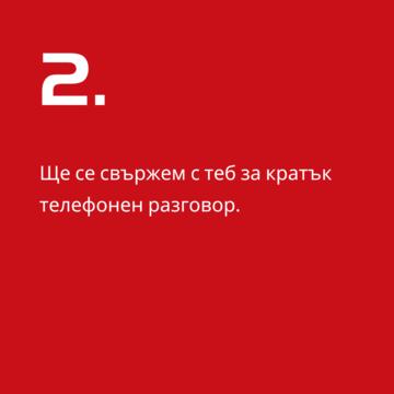 След като подадете своята кандидатура, ще проведем кратък телефонен разговор, след който ще бъдете поканен/а на среща на място, ако продължите към следващия етап на процеса.