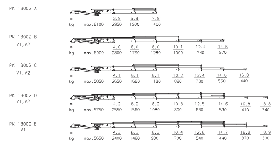 The outreaches stated are with a boom angle of 20° and are therefore not the maximum. When using mechanical boom extensions, the loads shown on the charts need to be reduced by the weight of these extensions.