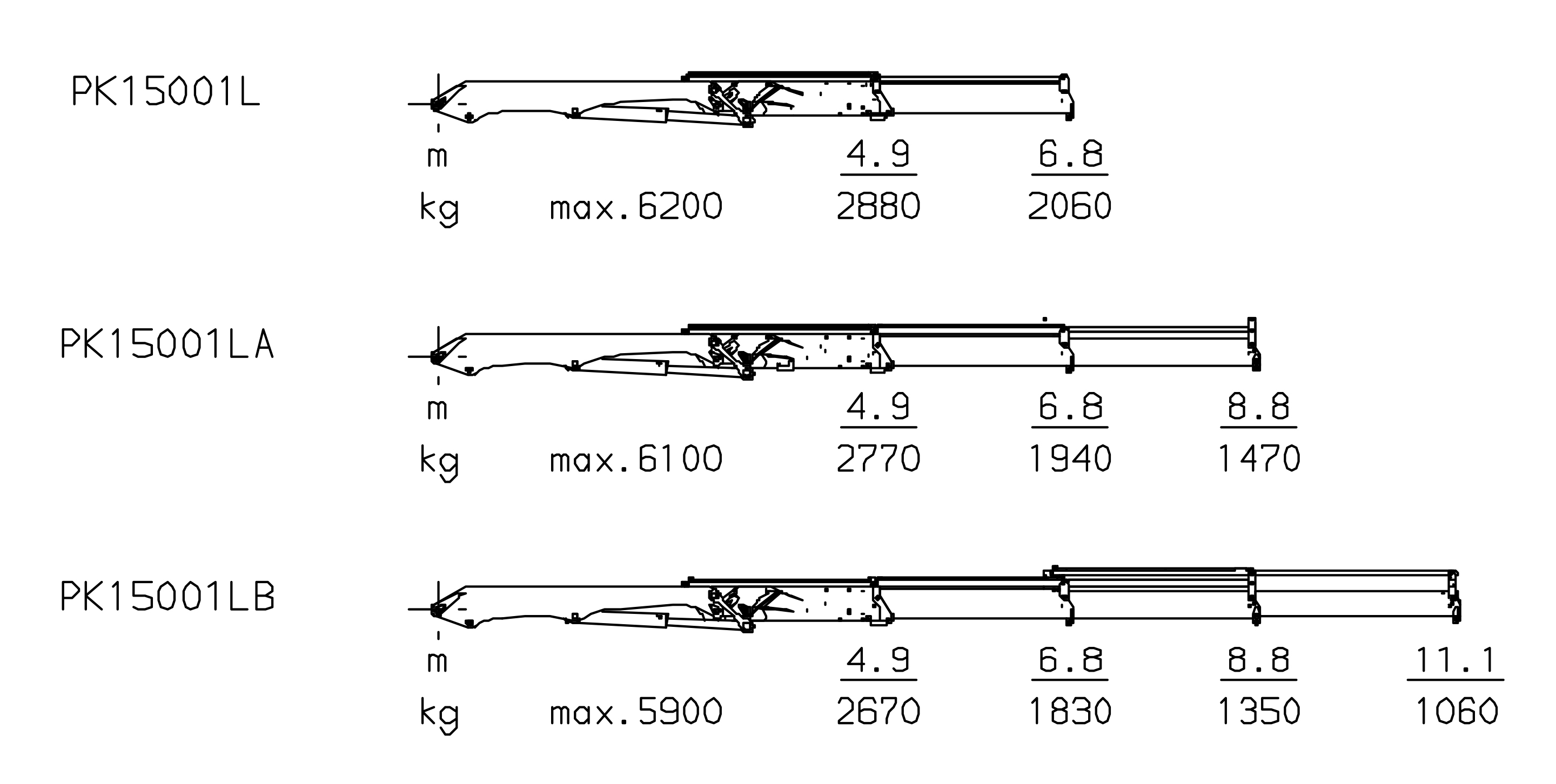 The outreaches stated are with a boom angle of 20° and are therefore not the maximum. When using mechanical boom extensions, the loads shown on the charts need to be reduced by the weight of these extensions.