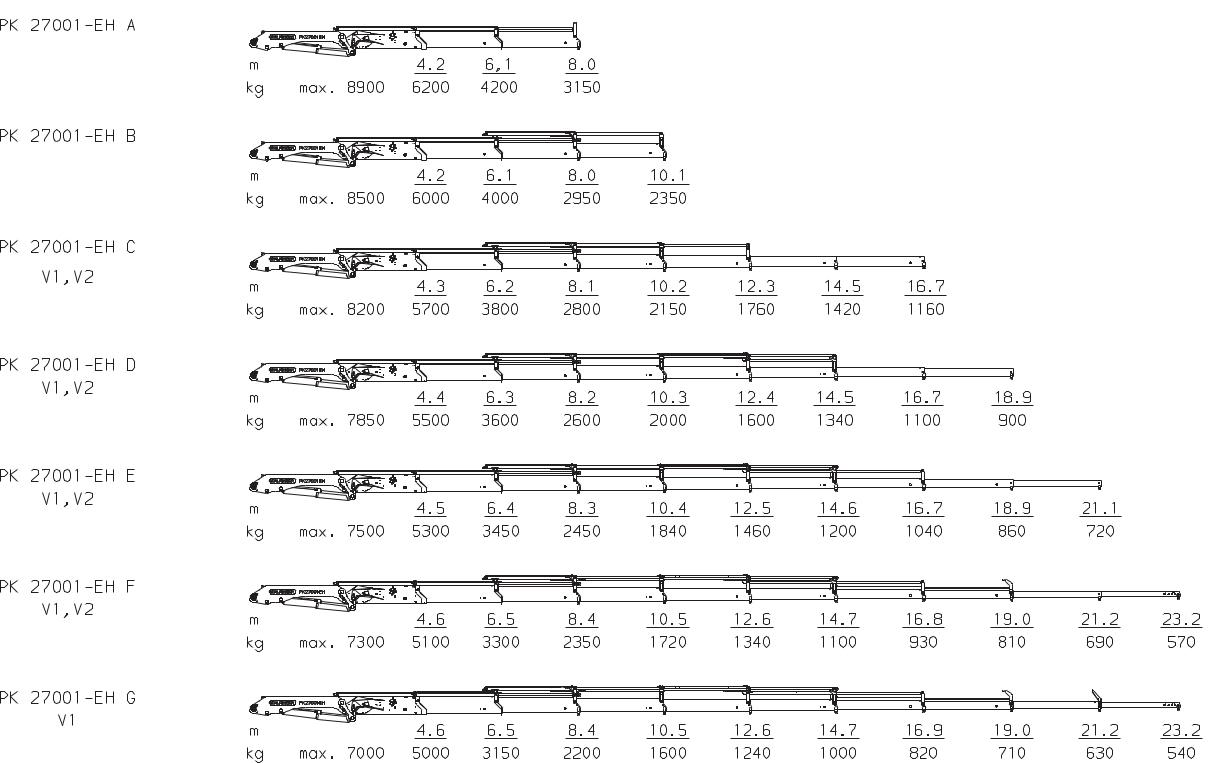 The outreaches stated are with a boom angle of 20° and are therefore not the maximum. When using mechanical boom extensions, the loads shown on the charts need to be reduced by the weight of these extensions.
