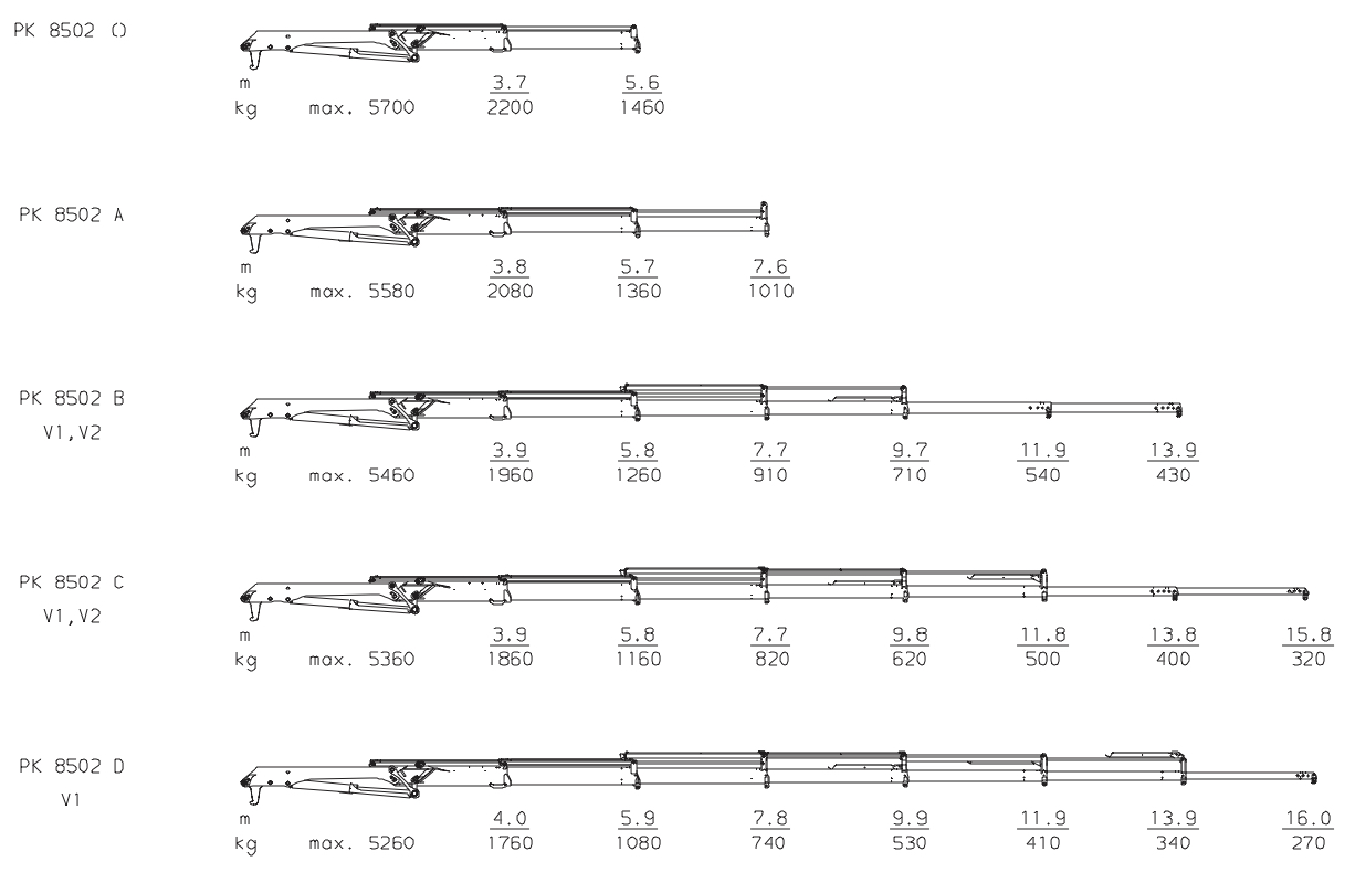 The outreaches stated are with a boom angle of 20° and are therefore not the maximum. When using mechanical boom extensions, the loads shown on the charts need to be reduced by the weight of these extensions.