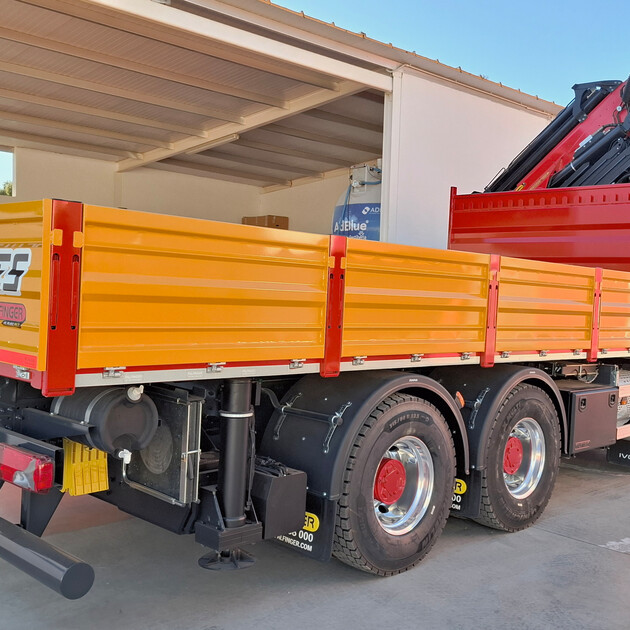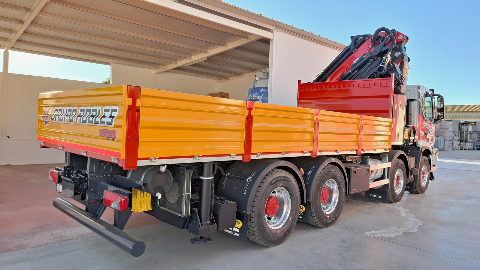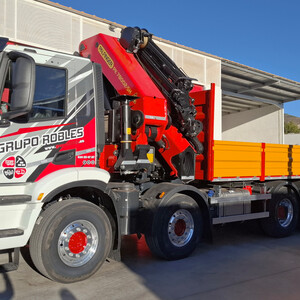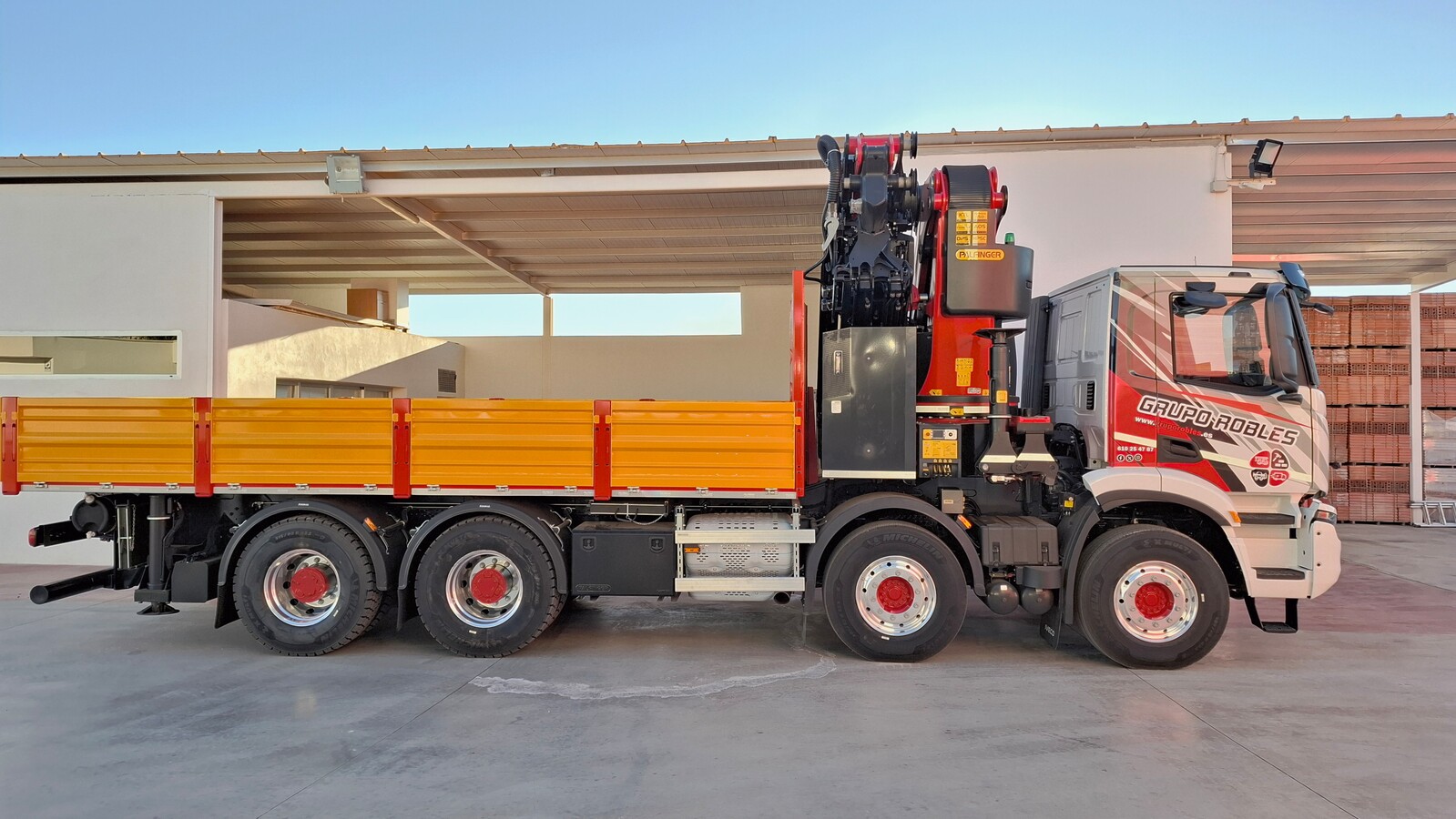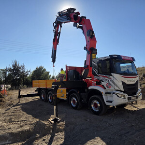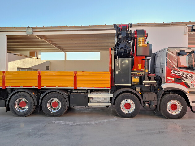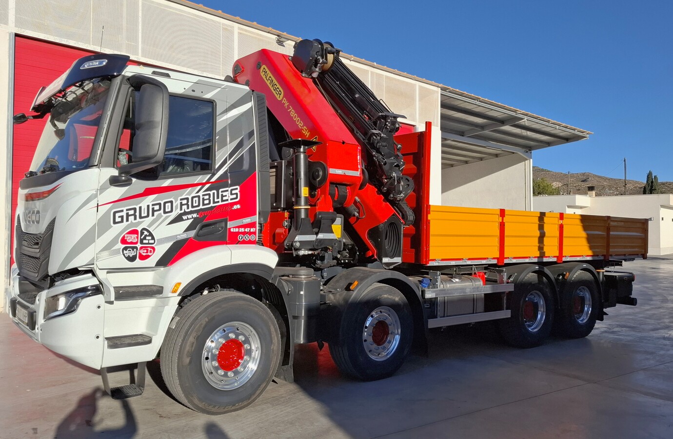La grúa PALFINGER PK 78002 SH de alta gama, está montada sobre camión IVECO AD410T46 8x4. Cuenta con 6 prolongas hidráulicas (E), Fly-jib PJ170E con 6 prolongas hidráulicas adicionales, lo que le permite un alcance horizontal de 26,3m y hasta 1340kg de carga. Además, lleva incorporado un cabrestante hidráulico 2.5t MFA instalado en el brazo principal, un depósito adicional de aceite 350L y el mando Palcom P7.