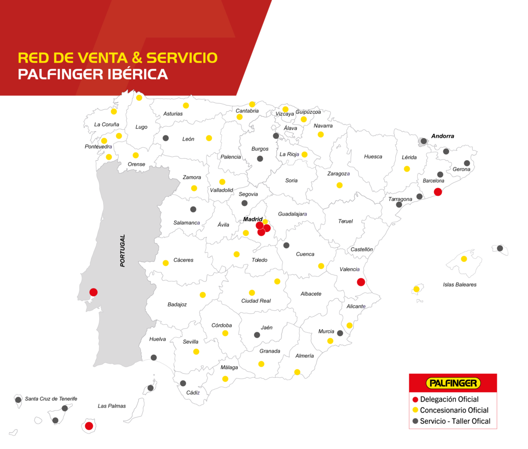 La fuerte Red de Ventas y Servicio de PALFINGER en España, otorga a sus clientes el añadido de respuesta inmediata y eficiente en venta de repuestos, servicios de reparación y mantenimiento de la maquinaria PALFINGER. El cliente podrá estar seguro de que su máquina siempre funcionará de manera correcta independientemente de su lugar de trabajo en España.