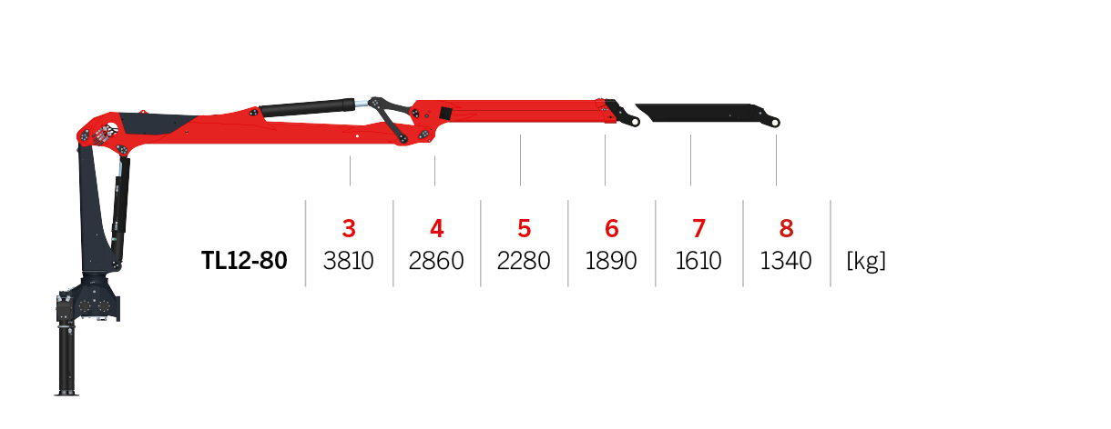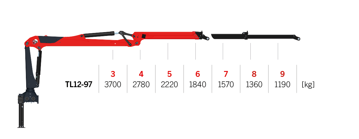 This L-type crane has a lifting capacity of 12 metric tons and is available in two arm lengths: 8.0 m and 9.7 m. Featuring robust protection for the hydraulic system, the high-performing TL12 offers four different control methods and optional PALFINGER Smart Control.
