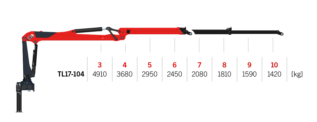 This Generation 3 L-type crane has a lifting capacity of 17 metric tons. Featuring robust protection for the hydraulic system, the high-performing TL17 offers four different control methods and optional PALFINGER Smart Control.