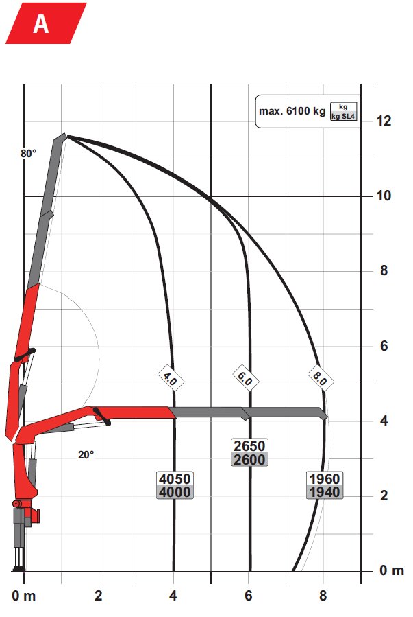 Si necesitás izar una carga de 4.000 kg a un radio de 4 metros, la tabla de carga de la PK 17.001 SLD 3 (en su versión A con una extensión hidráulica) indica que la capacidad permitida es de 4.050 kg. En este caso, el equipo opera dentro de su límite de seguridad, considerando que su capacidad máxima nominal teórica es de 6.100 kg.