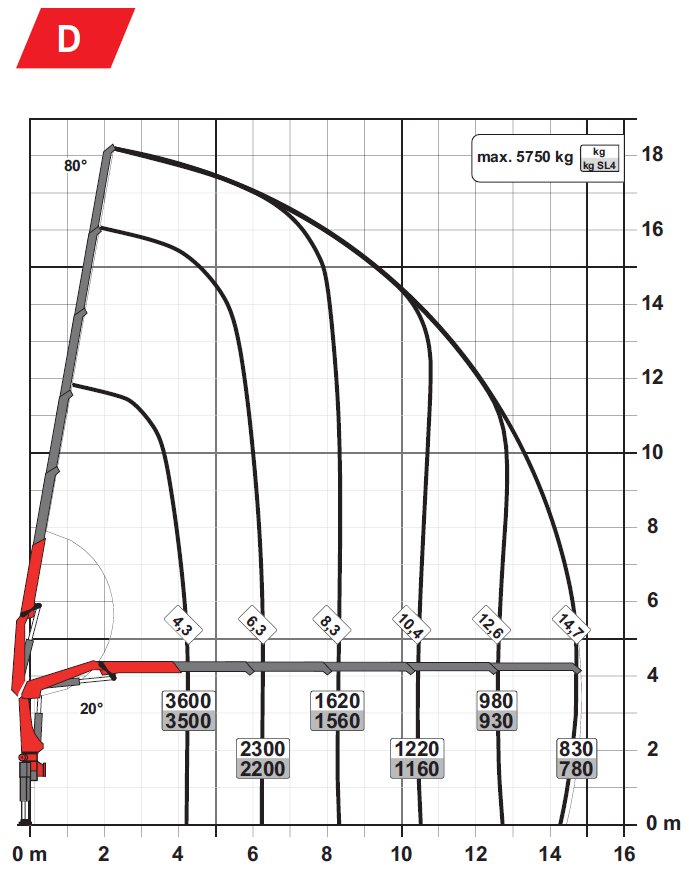 Si la misma carga de 4.000 kg debe ser izada a un radio de aproximadamente 8 metros, la tabla de carga (en la versión D con cuatro extensiones hidráulicas) muestra que la capacidad de izaje cae a 1.620 kg. En esta condición, la carga de 4.000 kg supera ampliamente el límite seguro, lo que vuelve la operación inadecuada.