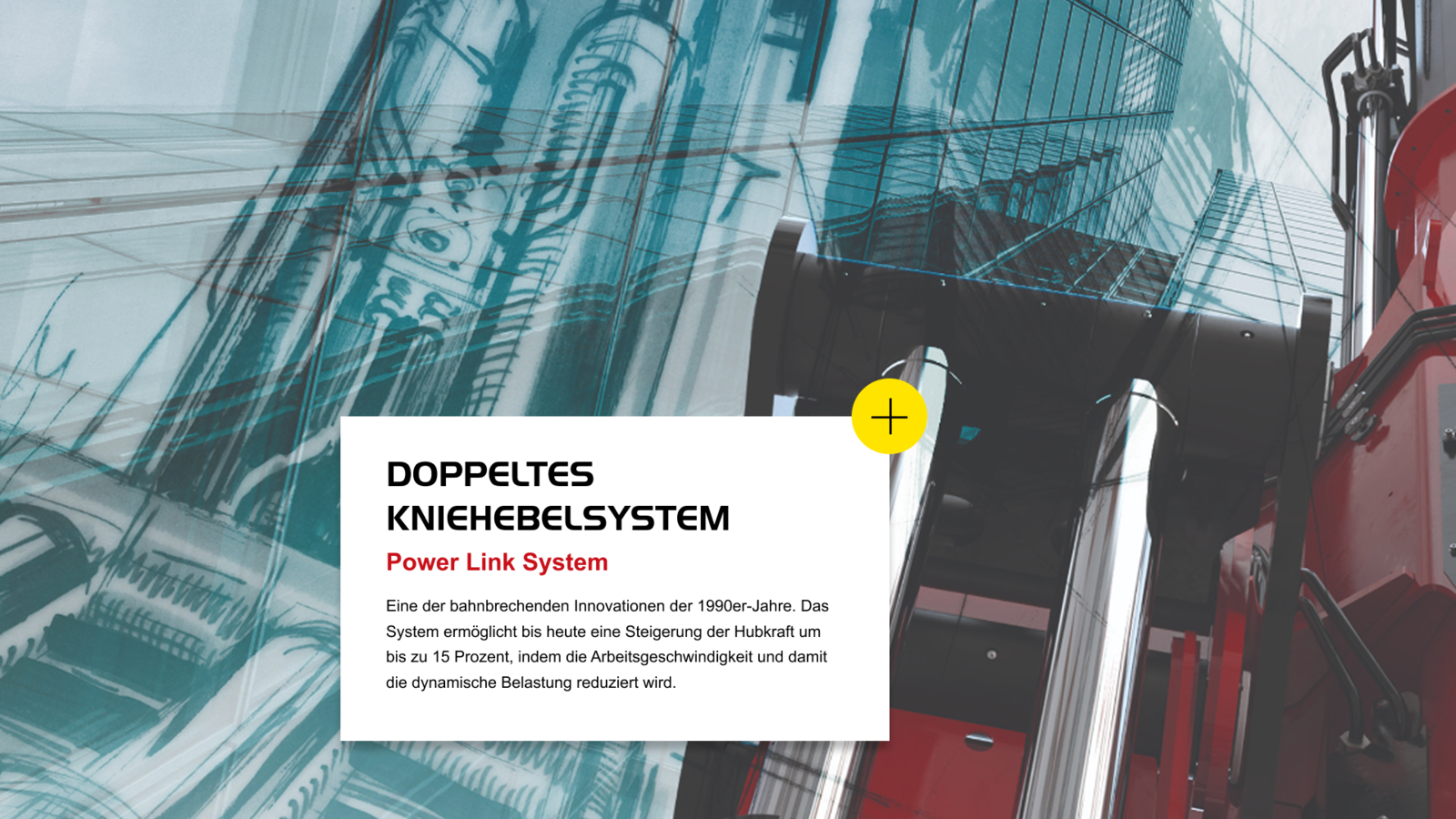 Wer wagt, gewinnt: PALFINGER führt mit dem Power-Link-System ein doppeltes Kniehebelsystem – sowohl am Haupt- und am Knickarm – ein. Ein riskanter Schritt, da teurer und aufwändiger als ein Kran ohne Kniehebel – man braucht zusätzliche Gelenke, Bolzen und Lagerstellen. In den 1980er-Jahren ist das Power-Link-System Alleinstellungsmerkmal. Heute ist das doppelte Kniehebelsystem bei Ladekranen weltweit Standard.