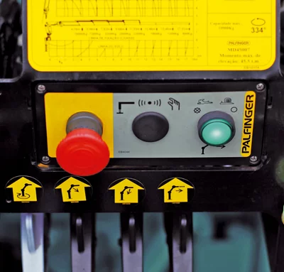 A NR12 também exige que toda máquina deve ser equipada com um botão de parada de emergência. Logo, essa funcionalidade está presente em todas as linhas de produto da PALFINGER. O operador pode acionar o botão em situações de perigo para bloquear todas as operações e garantir a segurança de todos.