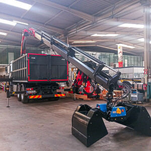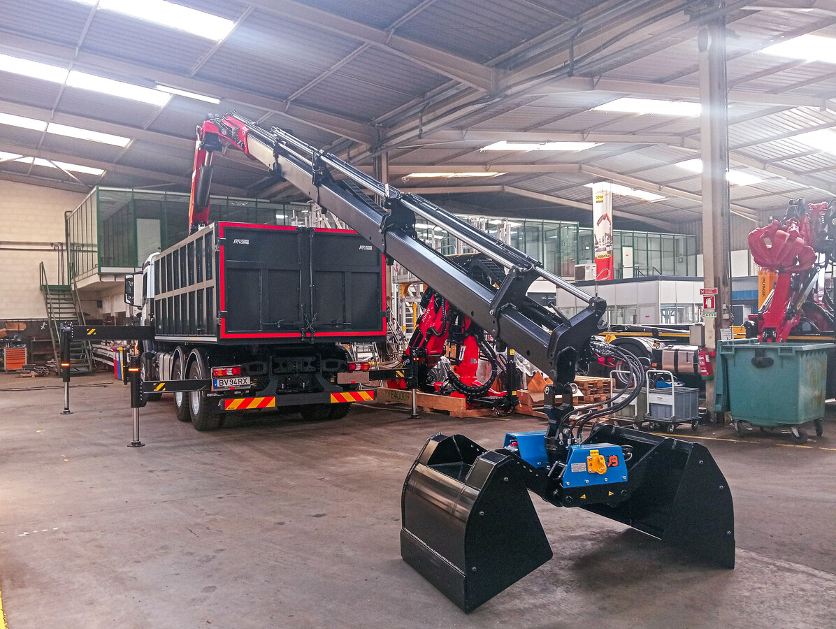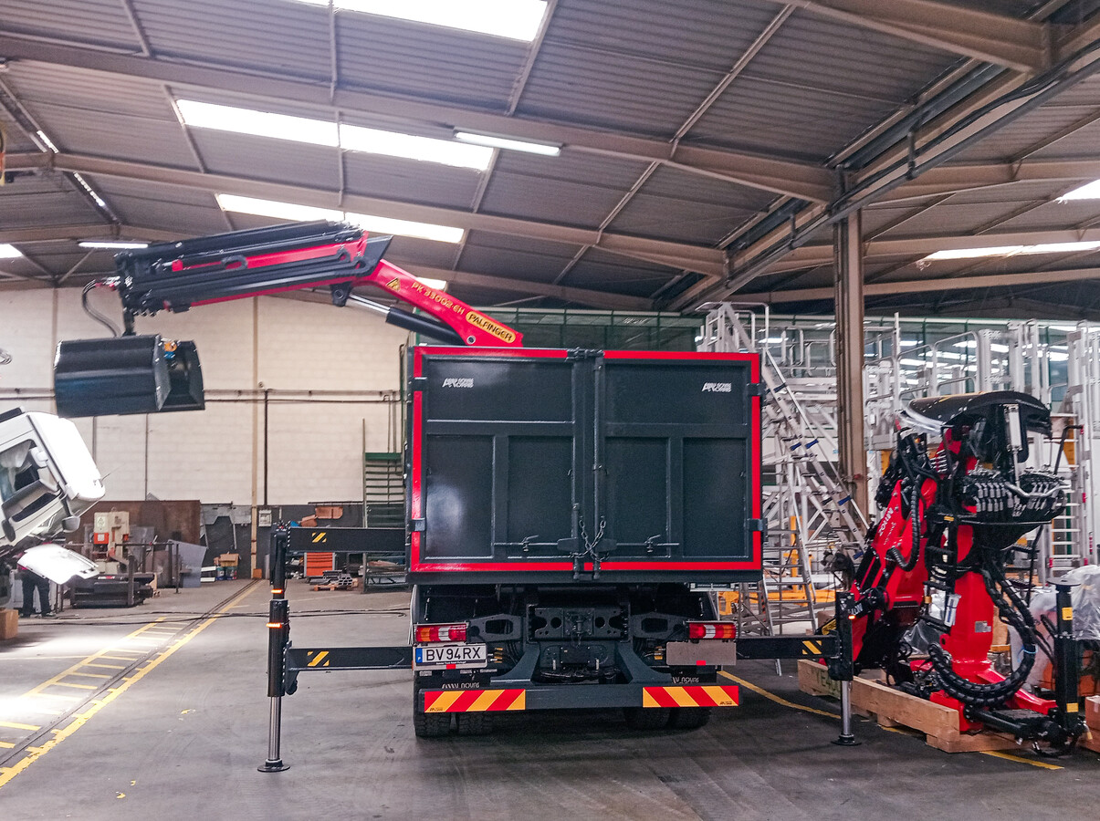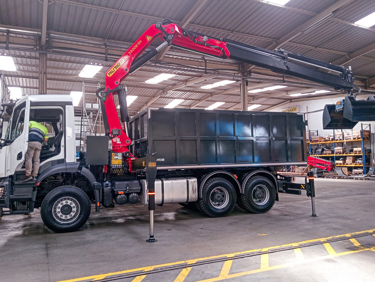 A grua está equipada com uma caixa de carga monobasculante, que amplia as soluções de transporte e descarga de materiais, e com o acessório BDVEZ XL 100 — um balde hidráulico que permite a manipulação de materiais soltos, acrescentando versatilidade à operação.