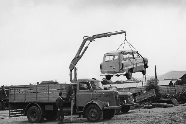 Historical image of the first PALFINGER truck mounted loader crane