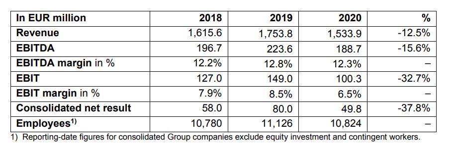 In fiscal year 2020, the Group revenues of PALFINGER AG was EUR 1,533.9 million, down from EUR 1,753.8 million the previous year. In comparison to 2019, the EBITDA decreased by 15.6 percent to EUR 188.7 million, and at 12.3 percent, the EBITDA margin lies below 2019’s 12.8 percent. The EBIT decreased to EUR 100.3 million from EUR 149.0 million in 2019. The EBIT margin decreased from 8.5 percent in 2019 to 6.5 percent in 2020. Consolidated net result in 2020 declined 37.8 percent to EUR 49.8 million in comparison to a record of EUR 80.0 million in 2019.