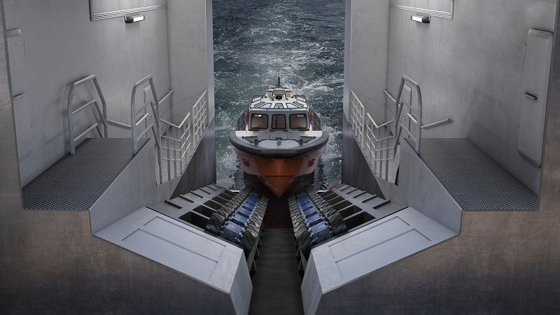 Slipway access/entrance: Via submerged wheel units on vessel transom